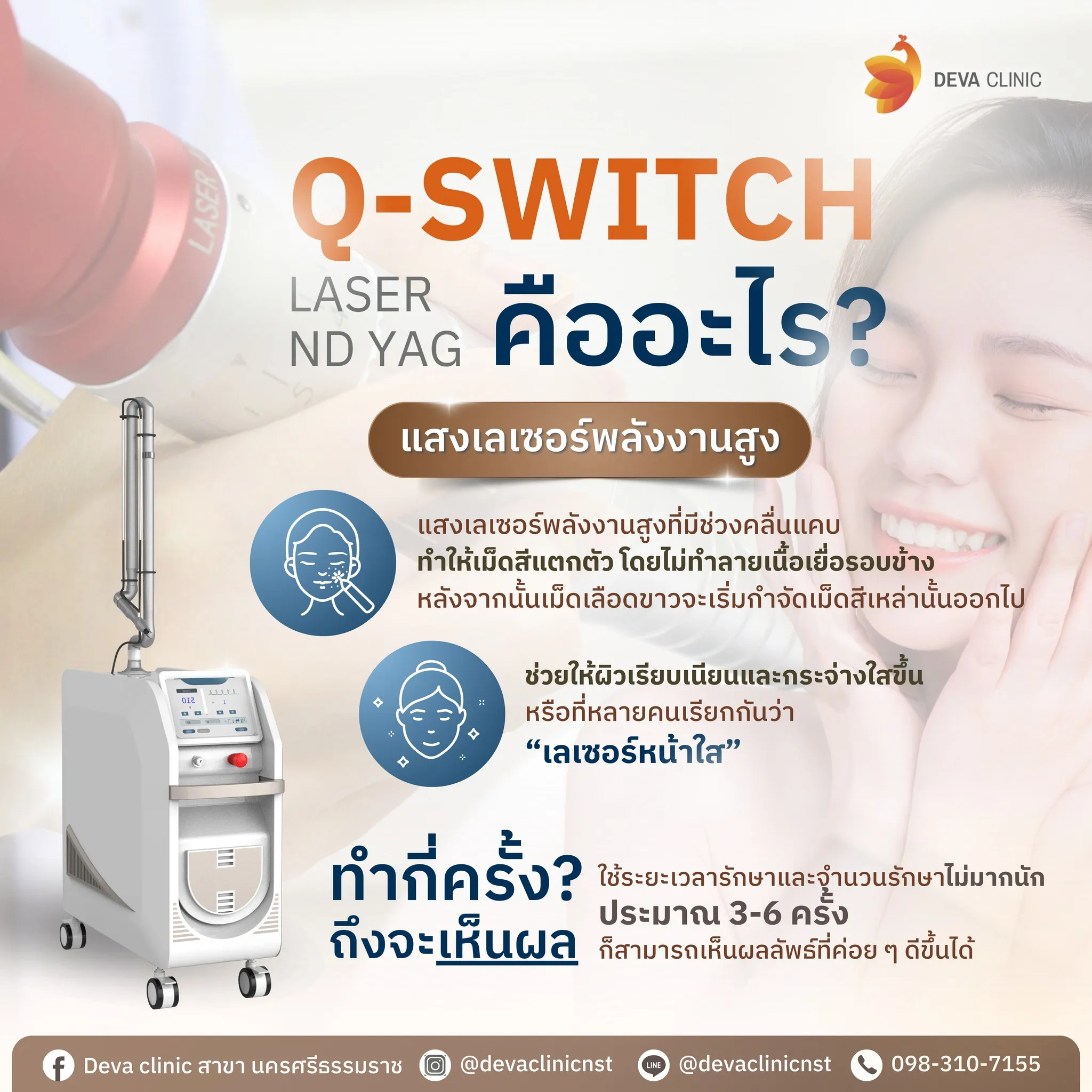 ส่วนฝ้า/กระ หรือลบรอยสัก แนะนำต่อเนื่อง 3-5 ครั้งขึ้นไป เพื่อผลลัพธ์ที่ชัดเจน